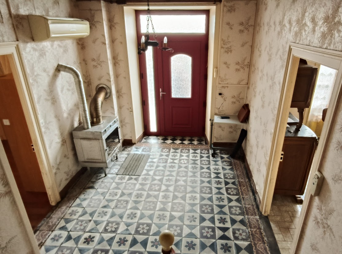 Une entrée ouverte sur la pièce de vie, équipée d’un poêle à bois et d’une climatisation réversible,
