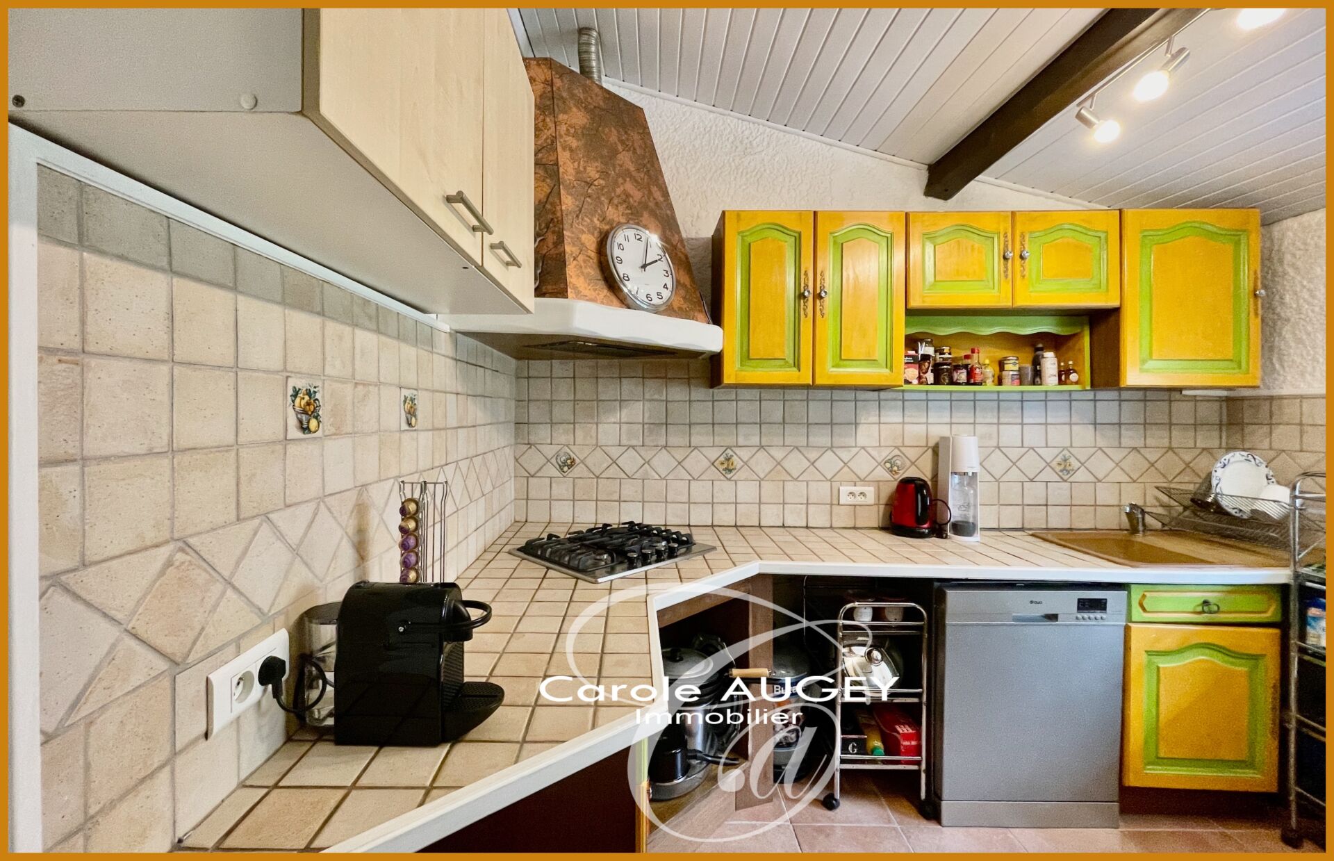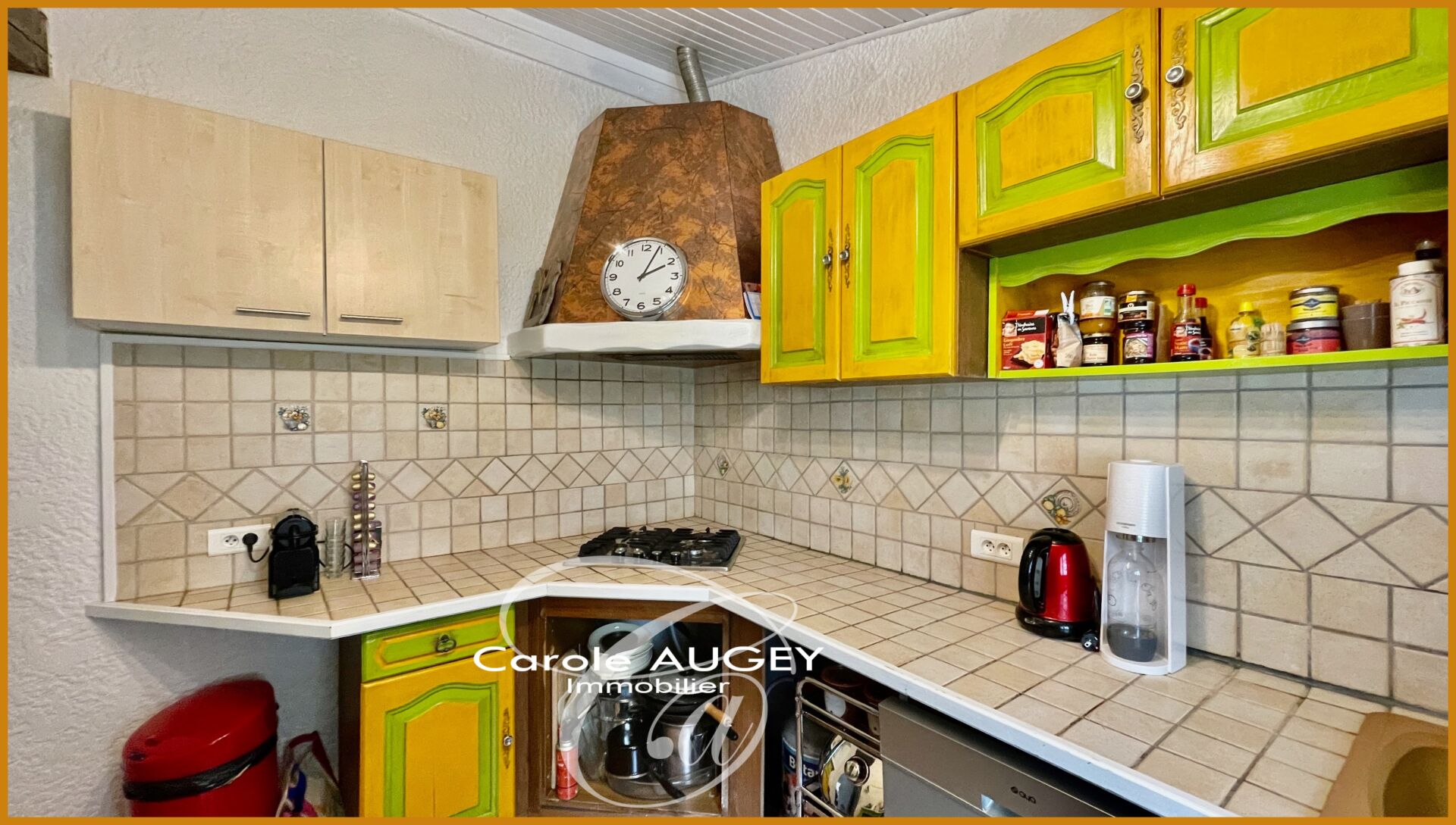 La pièce de vie, lumineuse et conviviale, est animée par une grande cheminée à foyer ouvert. La cuisine séparée, pratique, pourra facilement être repensée selon vos envies.